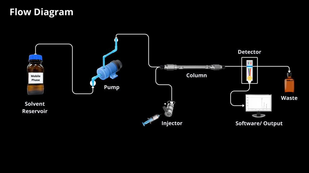 - A detector is needed to see the separated compound bands as they elute from the HPLC column (most compounds have no colour, so we cannot see them with our eyes). The mobile phase exits the detector and can be sent to waste, or collected, as desired.